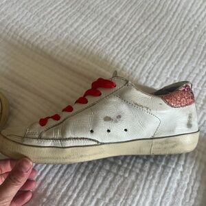 You can see where I added glitter to cover. Real Golden Goose but discounted price reflected with the repair. The original green laces are also included with the red that I added.