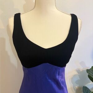 Elegant vintage dress. Features a striking blue and black design. Perfect for special occasions. Side zipper and top clasp.