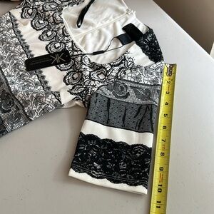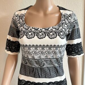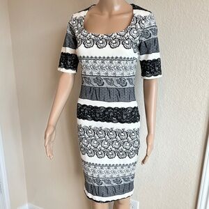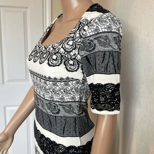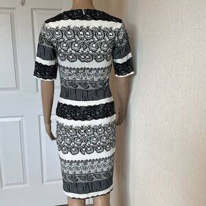 Chic midi dress with black and white stripes. Features intricate patterns. Perfect for stylish outings.
