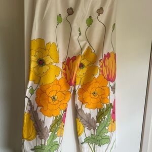 Step into a world of vibrant style with these Trina Turk pants, showcasing a captivating floral print in pink and white. The wide-legged silhouette offers a relaxed fit, perfect for casual outings. Embrace the fresh, artistic design that brings a touch of elegance to your wardrobe.