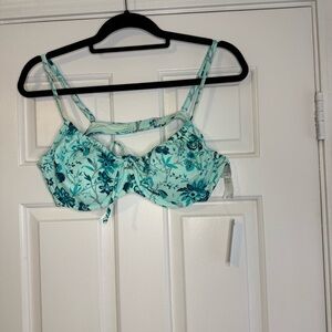 Stylish bikini set featuring a floral pattern. Aqua base with black floral accents. Perfect for beach days.