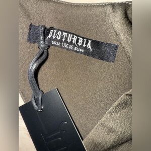 Embrace elegance with this green midi dress by Disturbia, featuring a chic V-neckline and romantic 3/4 puff sleeves. Perfect for a wedding guest or a night out, its A-line silhouette gracefully flows to mid-calf, offering both style and comfort.