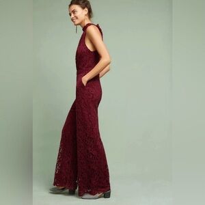 NWT! Anthropologie ett:twa Red Wine/Bordo Lace, Tie Halter, Wide-Leg Jumpsuit