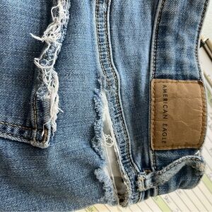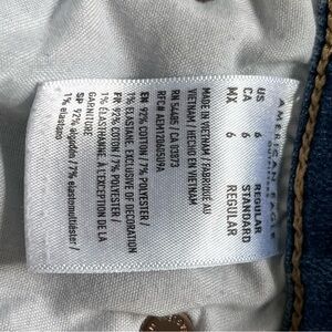 These high rise blue jeans from American Eagle Outfitters feature a classic medium blue wash with a slightly faded, worn-in look. The full-length design is complemented by a frayed hem, adding a touch of casual style. Perfect for any laid-back occasion, these jeans offer a timeless appeal.