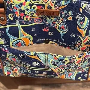This is an absolutely gorgeous sakroots purse. It says love song on it and the music and rhythm guides us infinite in a couple of places on the bag. It also has a beautiful keychain attached to it with several color tassels too. The bag has a front and back exterior pocket. The inside has pockets too. The bag measures 15” x 10” x 4.5”. Feel free to make me an offer.
