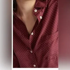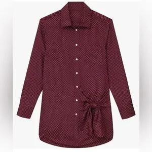 Maroon polka dot long sleeve silk dress with Thakoon's classic wrap tie design. Inspired by the idea of borrowing a menswear oxford buttondown shirt, it can be worn as a stand-alone mini dress or as a laid-back tunic over our silk drawstring pants.