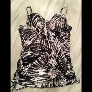 In good condition, Love your Assets Spanx Swimwear Push Up Underwire Tankini Top with Ruched Sides, padded cups and adjustable straps. Black and white. Underwire cups have heavy graduated padding along the bottoms of cups.Covered elastic straps adjust in back with silvertone metal hardware.Covered elastic bottom sides ties provide perfect fit. Bottom Not Included. Look slim while you swim. Day dream/ Black white. No trades