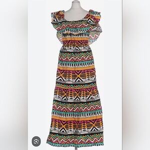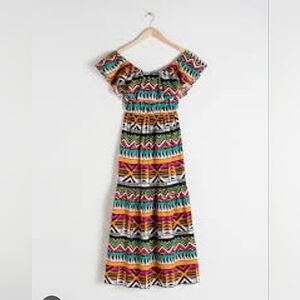 This stunning maxi dress by & Other Stories showcases a vibrant orange and green palette, perfect for resort wear. The sleeveless design features a playful off-the-shoulder neckline with flutter sleeves, complemented by a ruffled, tiered silhouette that adds movement and charm.