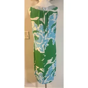 Elevate your wardrobe with this stunning Tory Burch sleeveless shift dress in a bold, abstract green, blue, and white floral print. Crafted from luxurious 100% silk with a fully lined polyester interior, this dress features a striking silver sequin neckline, creating an effortlessly chic and polished look.