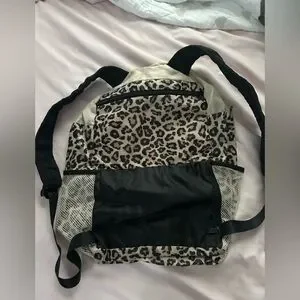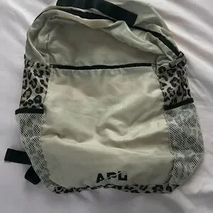 APL backpack with leopard print sides. Cream body with black accents. Stylish and functional.
