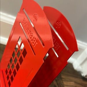 Stylish red telephone booth bookends. Perfect for adding a pop of color to your shelf. Small little chip on one of the top corners. See last photograph.