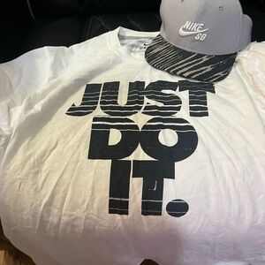 White tee with bold black 'Just Do It' text. Gray cap with patterned brim. Nike logo on both.