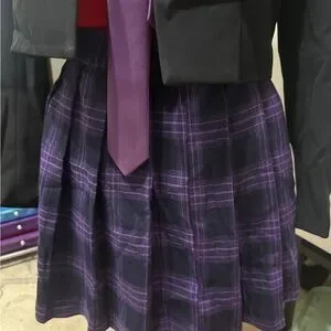 Stylish purple plaid skirt paired with a black blazer. Features a matching purple tie. Perfect for a chic and trendy look.