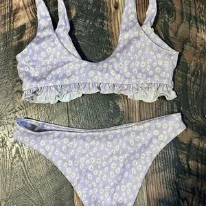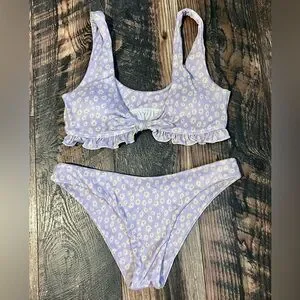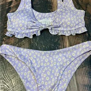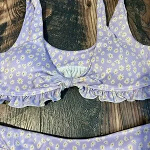 Charming purple bikini with ribbed floral pattern. Features ruffle details with tie bow in front. Perfect for summer vibes. Both top and bottom are size small and in great condition.