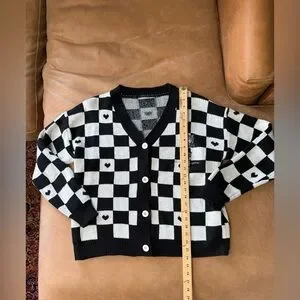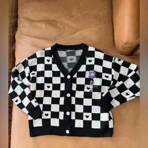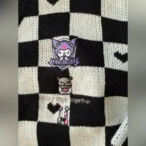 Stay cozy while showing off your love for anime with this cute cardigan featuring a black and white check pattern with embroidered accents of your favorite characters from Hello Kitty and Kuromi. The V-neckline and long sleeves make it perfect for the colder seasons of fall and winter, and the knit fabric type provides a comfortable and warm feel. This boxy fit cardigan is perfect for casual occasions and can be paired with your favorite jeans or leggings for a complete look. Get ready to bundle up and stay stylish with this adorable sweater.