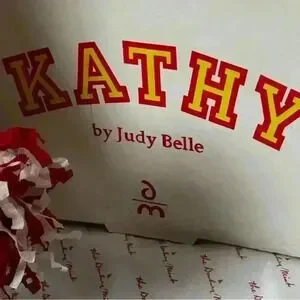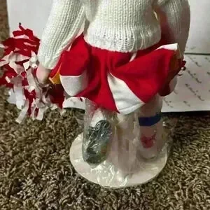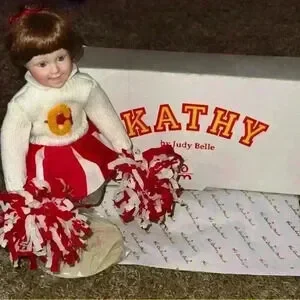 Charming ‘Kathy’ cheerleader doll from Judy Belle’s collection, showcasing vibrant cheer attire with pom-poms. Perfect for collectors or as a nostalgic gift.