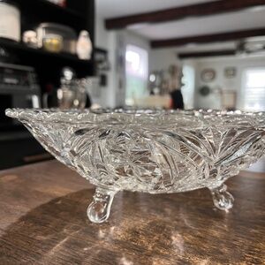 “This beautiful 3-toed footed glass bowl was made by the Anchor Hocking glass company. It is done in a pressed glass with an alternating fan and arch pattern with a scalloped edge and three toes on the bottom. The pattern is AHC26, or Arches & Fan referring to the pattern. Made in the USA.”