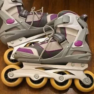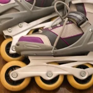 Roller Derby Aerio Elite series Q60 Inline Skates size 7. Purple, white, gray. Used, as is. Broken pull strap and no brake, shown in photos.