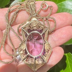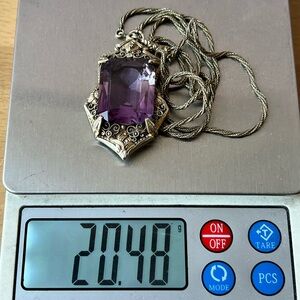 STUNNING ANTIQUE NECKLACE FROM THE ART DECO PERIOD WITH LARGE OVERSIZED EMERALD CUT AMETHYST STONE “PENDANT” SUSPENDED FROM LONG STERLING SILVER SORT OF TWISTED SNAKE CHAIN. THE NECKLACE IS HALLMARKED IN THE BACK “STERLING” AND “GERMANY”, ALSO HAS BEEN TESTED. THE NECKLACE IS VERY LIGHTLY GILDED OVER STERLING SILVER.