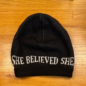 Gorgeous warm tuque by parkhurst with the saying, “she believed she could so she did” one size black with white writing. acrylic