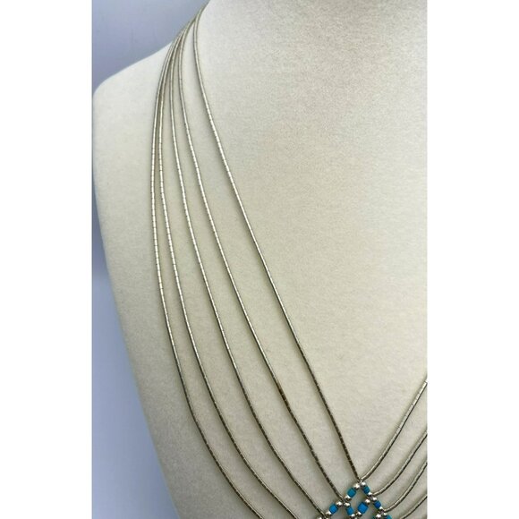 This vintage necklace is intricately woven with liquid silver and turquoise beads. The necklace beads test positive for 925 sterling silver.