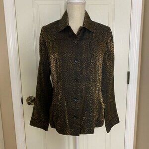Pretty button down blouse by Chico's. Blouse features black and bronze colored fabric with a shimmering effect. Long sleeves with button at cuff.