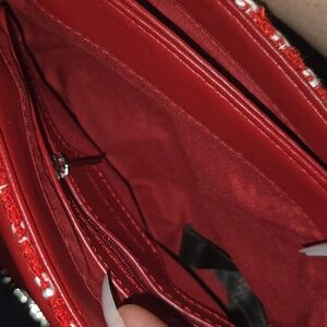 This striking red crossbody bag by Badgley Mischka features a tweed finish Its structured, rectangular design offers both style and functionality, making it a standout accessory for any occasion.