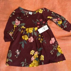 Set of two floral baby dresses. One in burgundy with yellow and pink flowers, the other in green with orange and cream flowers.