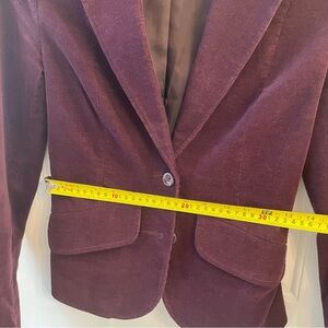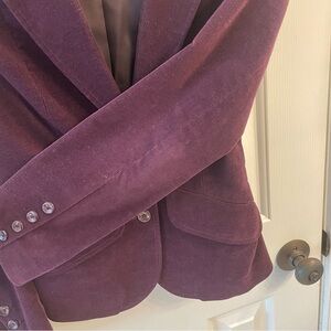 Deep eggplant purple two-bottom corduroy blazer with functional pockets. Size 4. Shows some wear from normal use, but generally very nice condition.