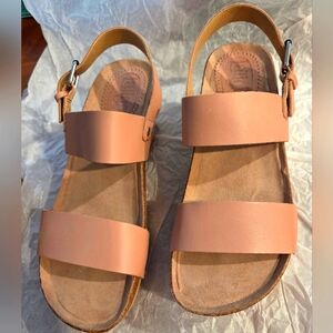 NIB Blush pink leather strappy sandal with minimalist straps, comfy cork footbed, and wood heel. Ankle strap with buckle closure ensures a secure fit, making them ideal for casual outings. Scandinavian-inspired look. Never worn. See photos for additional details. Size 10M.