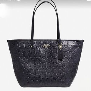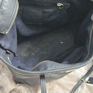 The Coach Blue Leather Tote features a sophisticated embossed pattern on its sleek exterior, offering a touch of elegance to your daily ensemble. Its structured design ensures durability and style, making it a versatile accessory for any occasion. With its spacious interior, this tote is perfect for carrying all your essentials effortlessly. Used but still has alot of life could use a wash only real wear is the little threads on the handles and can be washed inside but great everyday bag