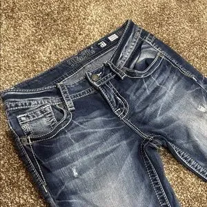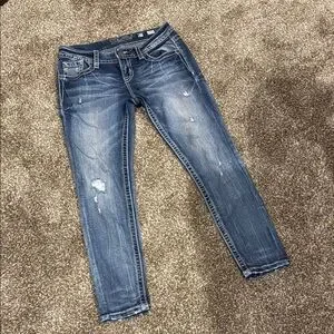 These Miss Me skinny jeans in a classic blue hue feature a stylish distressed look, perfect for a casual day out. Size 27 Signature Ankle Skinny