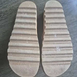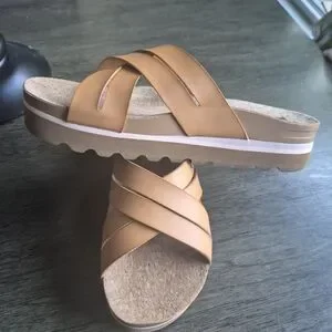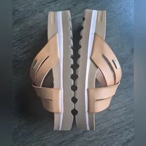 The Reef Women's Cushion Bloom Natural Criss Cross Platform Slide Sandals in size 9 are stylish and comfortable sandals perfect for casual or travel occasions. These slip-on sandals feature a solid brown color with a logo accent and a 1.5" wedge heel for added support. The synthetic upper material and cushioned design make them ideal for summer and spring seasons, providing both style and comfort for women on the go. The criss-cross platform and wide shoe width offer a trendy and practical option for everyday wear.