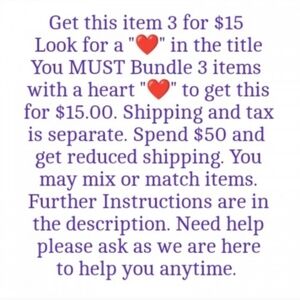 This item has a heart ❤️ therefore you can get this item for 3/$15 BUT you must add 3 listings to a bundle. It doesn't have to be the same item. You can mix or match items especially if we have only 1 available as long as the title has a heart ❤️ in it. If you don't add 3 items to a bundle you'll receive 1 item no ifs ands or buts.