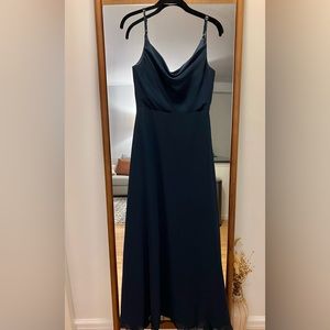 Elegant navy blue dress. Features a cowl neckline. Sleeveless design. Perfect for weddings. Hemmed to fit 5’3
