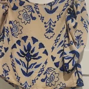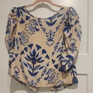 This relaxed, boxy blouse from Sienna Sky features a charming floral and botanical print in blue and cream. The 3/4 puff sleeves add a touch of elegance, while the light and flowy fabric ensures comfort and style. Perfect for a vintage-inspired look, this top is a versatile addition to any wardrobe.