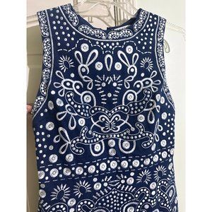 Elegant mini dress with intricate blue and white patterns. Sleeveless design. Perfect for any occasion.