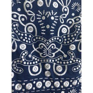 Features a white floral embroidery on a blue background ("Breakdown / Off White" color). Cotton blend (denim material), short mini length, sleeveless, round neckline, embroidered.