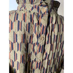 Stylish geometric pattern. Ruffle sleeves add flair. Perfect for any occasion. Please note: The second sleeve ruffle was removed by previous owner.