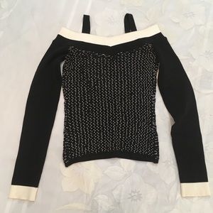 Stylish off-shoulder top featuring a chic black and white design. Perfect for casual outings or a night out. Enjoy the comfort and elegance of this versatile piece.