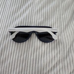 Stylish Carrera aviator sunglasses with vibrant blue lenses and white arms. Perfect for a modern look.