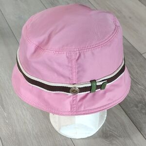 This Coach bucket hat combines a soft pink hue with a stylish brown band, offering a chic and sporty look. Crafted from lightweight fabric, it's perfect for warm weather and adds a touch of elegance to any casual outfit.