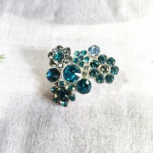 Small metal brooch with shades of blue crystals in the shape of flowers.