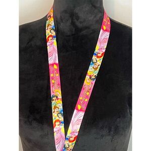 This Disney lanyard features a multicolor design with a Disney Princess pattern, suitable for unisex use. Made from fabric, it includes a detachable feature for convenience. The lanyard is part of the Disney character family and fits one size. It is not personalized or handmade. The item is pre-owned. Keywords: Disney lanyard, multicolor, unisex, Disney Princess, fabric, detachable, one size, pre-owned, character family, princess theme.