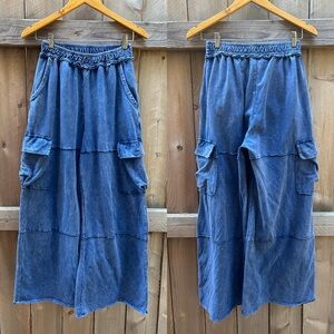 J Her boutique blue mineral wash cargo 100% cotton wide leg pants. I couldn’t find a product photo the model is showing a very similar pair but these don’t have a drawstring. They are tagged small but fits medium too. Im a size 8 and these fit me comfortably. Good condition there is a TINY hole on the seam in the back. Definitely not noticeable while wearing and could be fixed with just a few stitches.