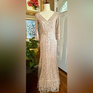 NWT Elegant Tadashi Shoji Tatiana Sequin Lace Gown in Beige/Champage Size 4