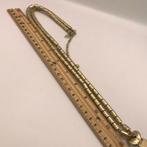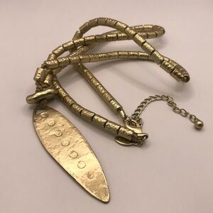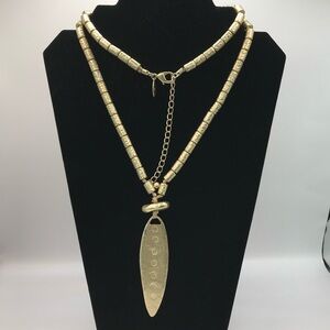 This stunning gold-tone necklace features a unique pendant design, perfect for adding a touch of elegance to any outfit. Its shimmering gold color makes it a versatile accessory for any occasion.