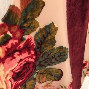 This top is stunning. Burnout velvet over a plain lining, lovely high neck and drape. I’ve worn it as a casual top with jeans. Good condition. Loose threads shown in photos. No fabric tag, but seems to be 100% polyester/nylon. Unique and gorgeous!