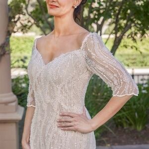 The Jade Couture gown dress in size 14 but has been taken in along the side seams 2 inches so closer to a size 12/10 now. This gown is stunning is a stunning A-Line dress with a peral beading a soft ruffle pattern. The sleeves are not lined 3/4 sleeves. The gown has a built in bra and would fit a fuller bustline beautifully. The dress has been professionally altered (another 150 dollars in alterations) in the waist and hips for a custom fit, but has never been worn. The long multicolor gown exudes elegance and sophistication, making it a perfect choice for special occasions or formal events. Was purchased from a bridal shop as a Mother of the Bride dress but went with another dress.