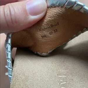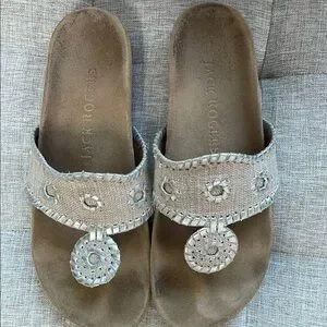 These Jack Rogers thong sandals in tan and champagne metallic offer a blend of comfort and style with their open-toe design and flat sole. The sandals feature a luxurious aesthetic with intricate detailing, making them perfect for both casual and semi-dressy occasions. Size 7